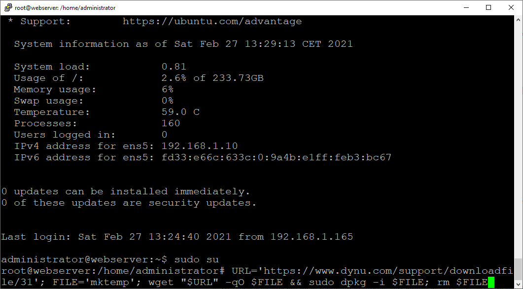 Nadat de serverlaptop weer is opgestart melden we aan met de gebruikersnaam en wachtwoord die tijdens de installatie zijn aangemaakt. Je kunt dit aan de laptop zelf doen, maar je kunt ook PuTTY gebruiken om m.b.v. SSH te verbinden naar het IP adres van de server laptop. Na het aanmelden gaan we eerst alle updates installeren.