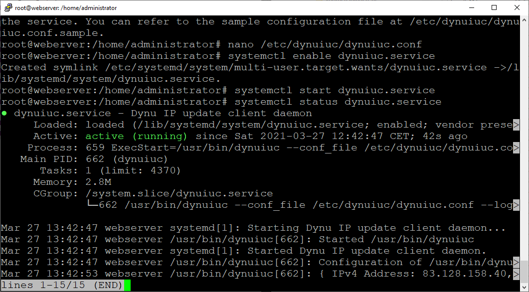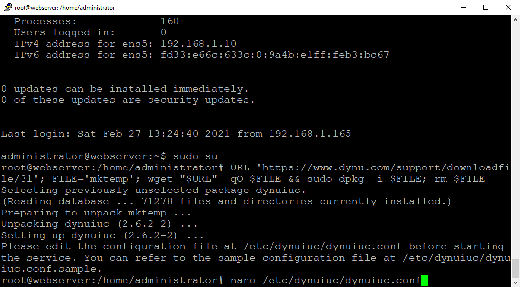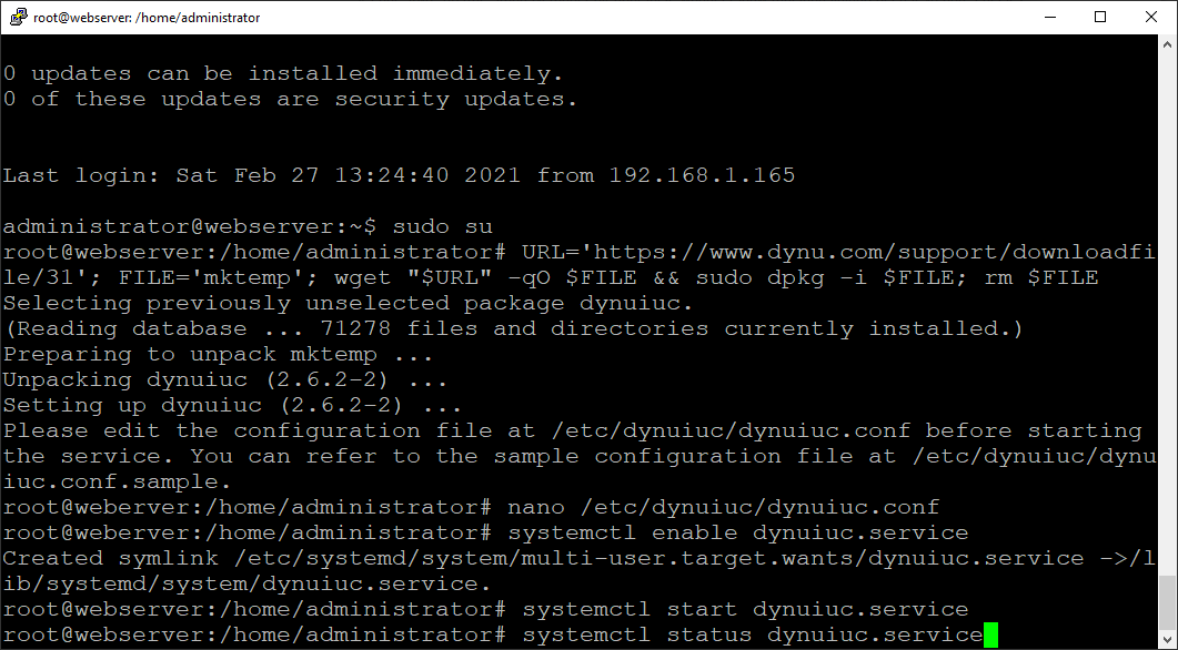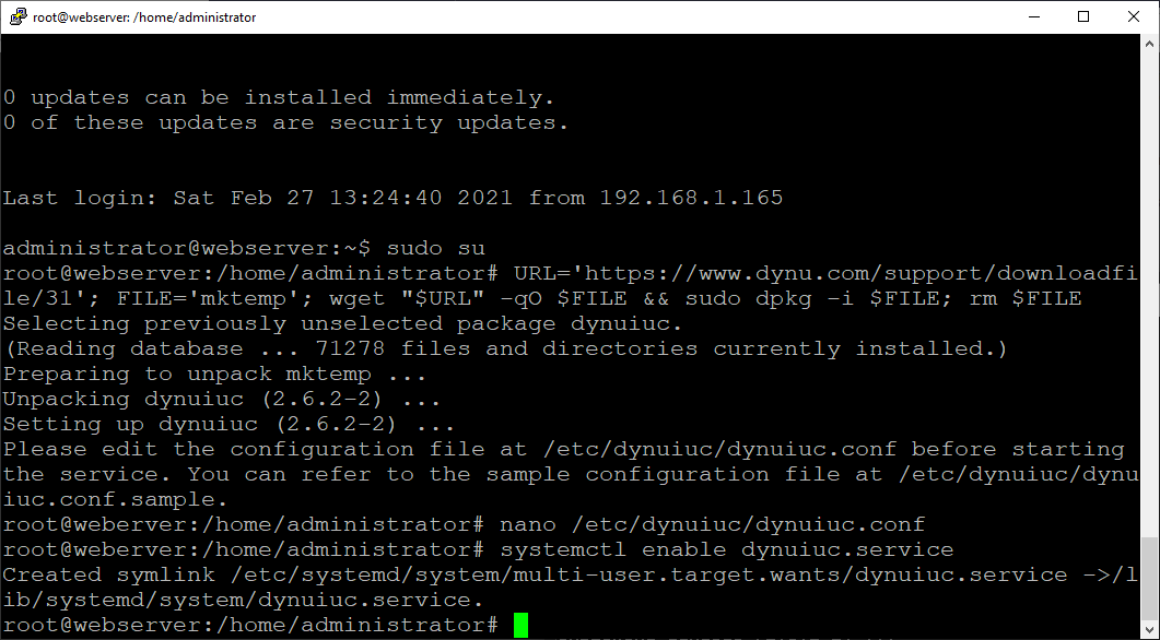 Je kunt de instructies voor het installeren van de update client vinden op https://www.dynu.com/DynamicDNS/IPUpdateClient/Linux. In ons geval volgen we de instructies die op deze pagina zijn beschreven voor Ubuntu 16. Eigenlijk is dit voor alle huidige Ubuntu versies gelijk. Hieronder vind je deze instructies ook stap voor stap.