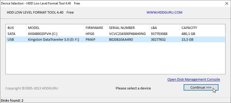1. Selecteer het juiste opslag apparaat, (je USB stick) en klik op de "Continue >>>" button. Zorg dat je je niet vergist, want het apparaat dat je hier selecteert gaat volledig gewist worden.