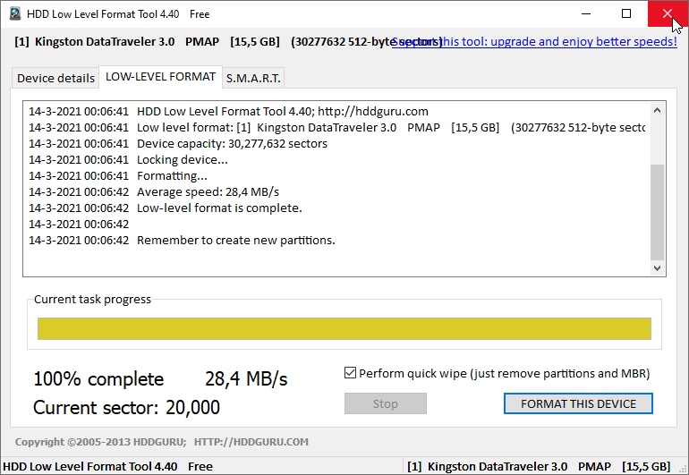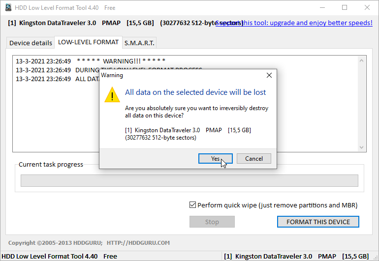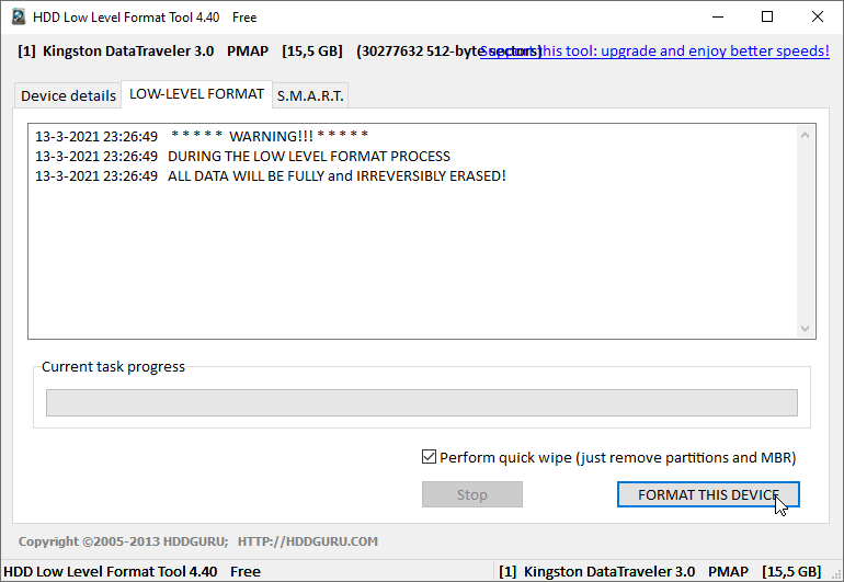 2. Selecteer de middelste tab (LOW-LEVEL FORMAT), zet een vinkje bij de optie "Perform quick wipe" en klik op de "FORMAT THIS DEVICE" button.