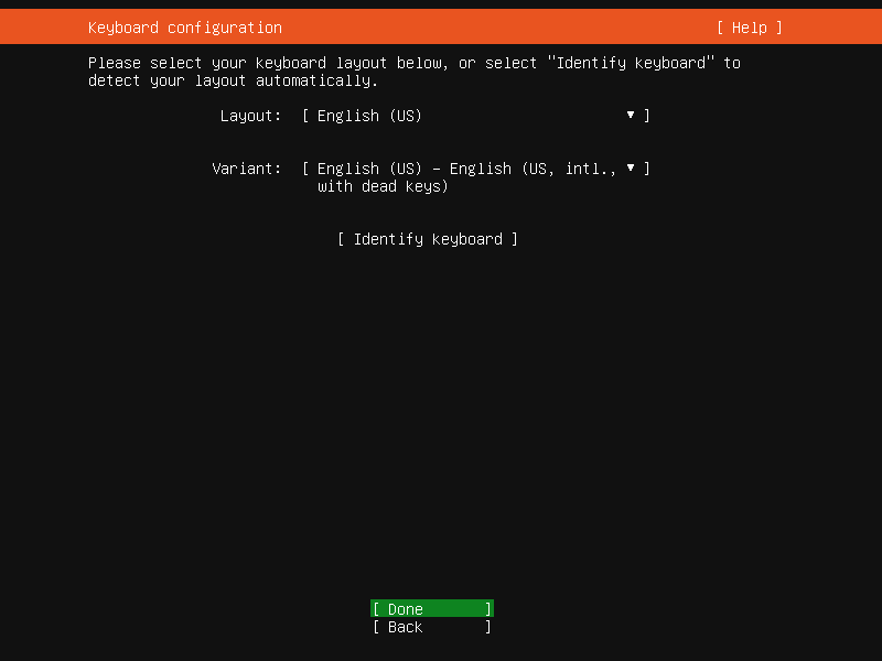 1. Vervolgens verschijnt het keyboard configuration scherm. Selecteer English (US) als layout en English (US) – English (US, Intl., with dead keys) als variant. Selecteer vervolgens onder in het scherm Done en geef Enter.