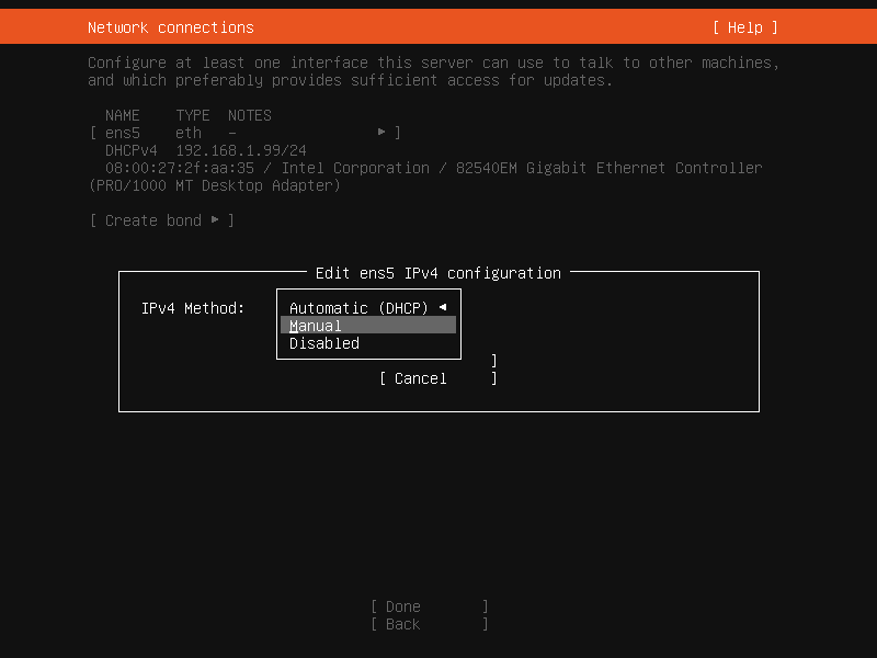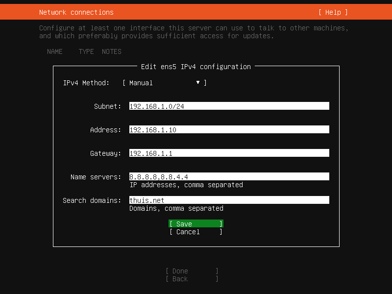 • Selecteer Save en geef Enter. Je komt nu weer terug in het Network connections scherm. Onder ens5 eth staat nu static 192.168.1.10/24.