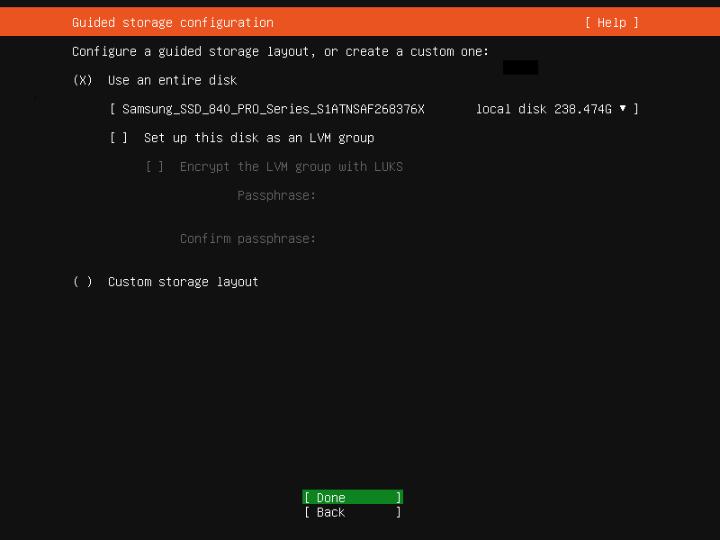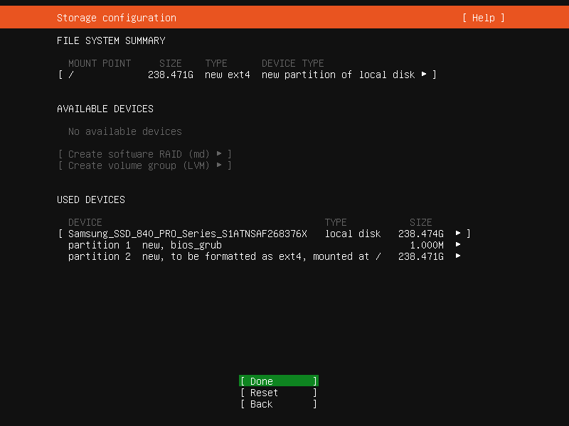 2. Je komt nu in het Storage configuration scherm dat er, als het goed is, uitziet zoals het middelste plaatje hieronder. Selecteer Done en geef Enter.