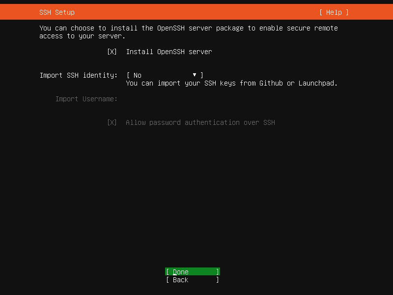 Selecteer [x] Install OpenSSH server, selecteer vervolgens Done en geef Enter.