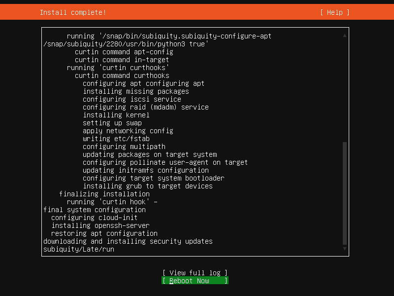 2. Selecteer, wanneer de installatie gereed is, “Reboot” om de server te herstarten.
