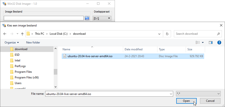 Als je het ISO bestand niet kan vinden om het te selecteren moet je in de drop-down box rechts-onder in het selectiescherm *.* selecteren (zie eerste screenshot hieronder)