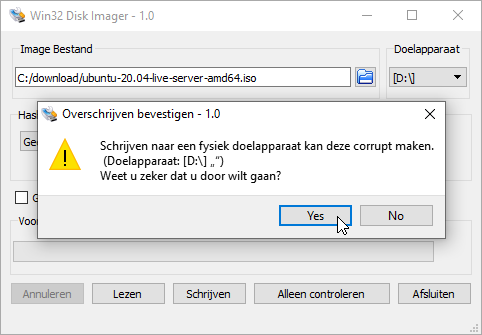 3. Selecteer het ISO bestand dat je eerder hebt ge-download, selecteer de USB stick als doel apparaat en klik op “Schrijven”.Er verschijnt nu een waarschuwing zoals in het middelste plaatje hieronder. Klik Ja om door te gaan.