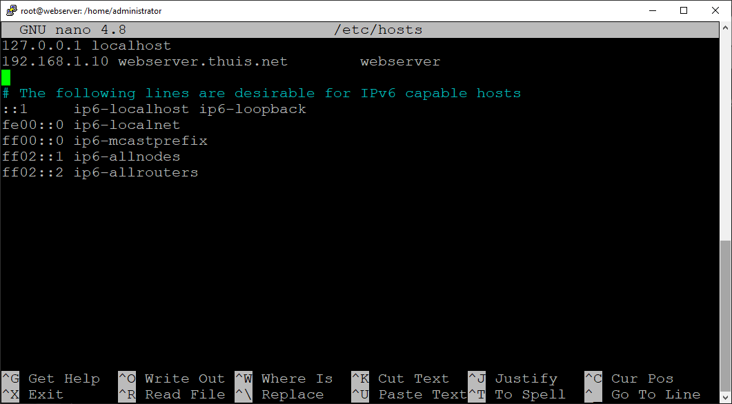 We verwijderen de regel ‘127.0.1.1 webserver’, en we vervangen hem door de regel:
