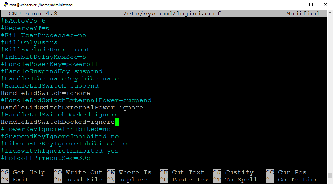 • Zoek de regel ‘#HandleLidSwitchDocked=ignore’ en